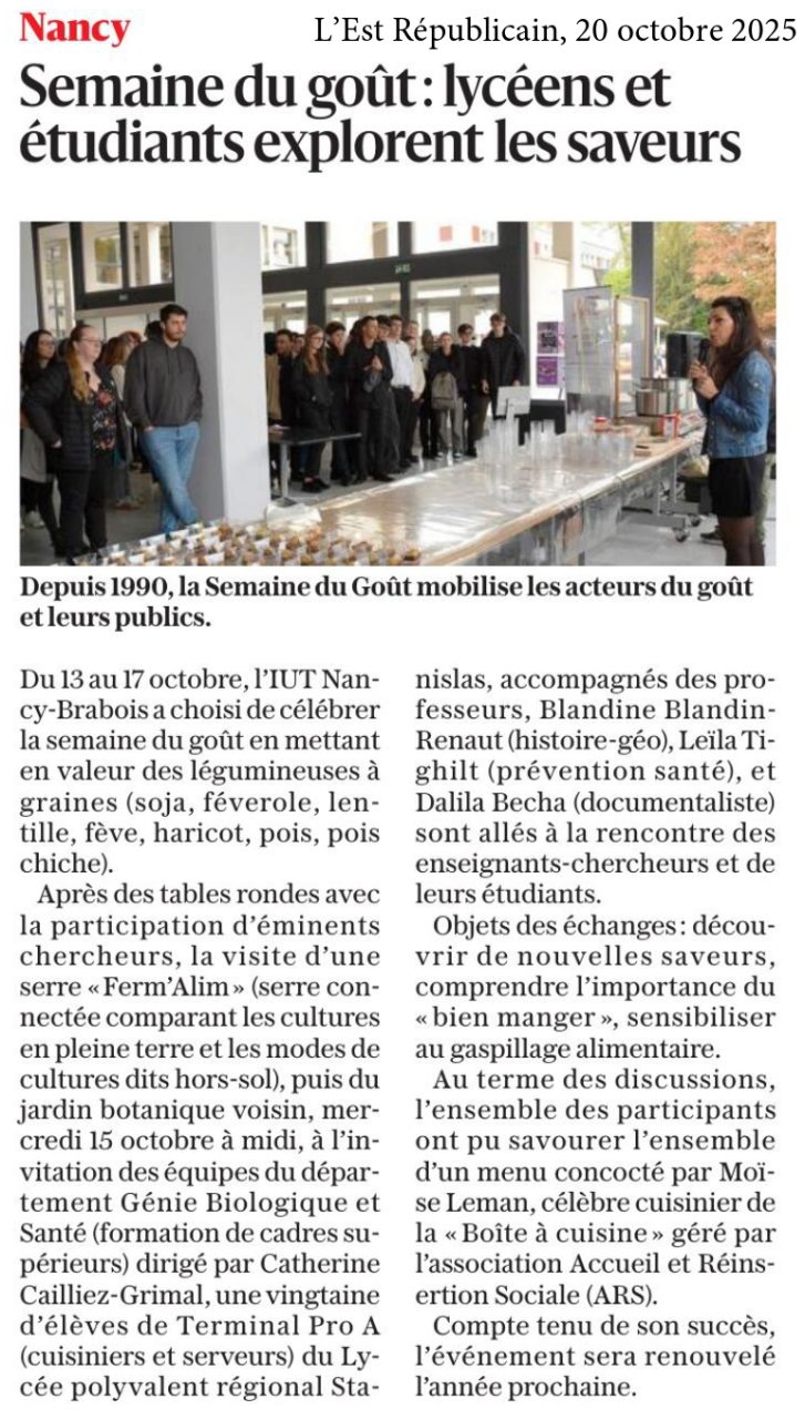À l’occasion de la Semaine du Goût, L’Est Républicain du 20 octobre 2025 a mis en lumière les initiatives de l’IUT Nancy-Brabois autour de la